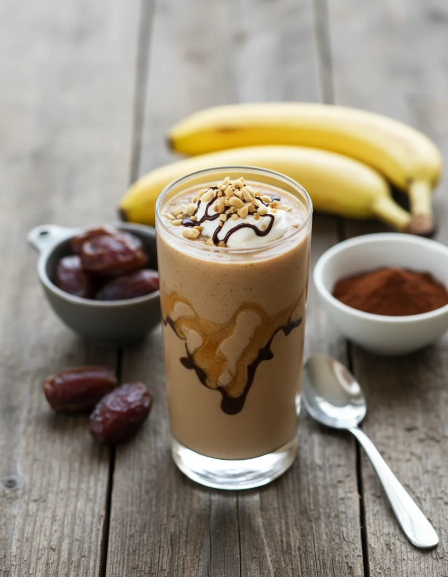 This vibrant vegan shake features frozen banana, rich peanut butter, and cacao, blended into a thick, creamy texture. Naturally sweetened and incredibly satisfying, it's a perfect healthy breakfast, snack, or dessert.