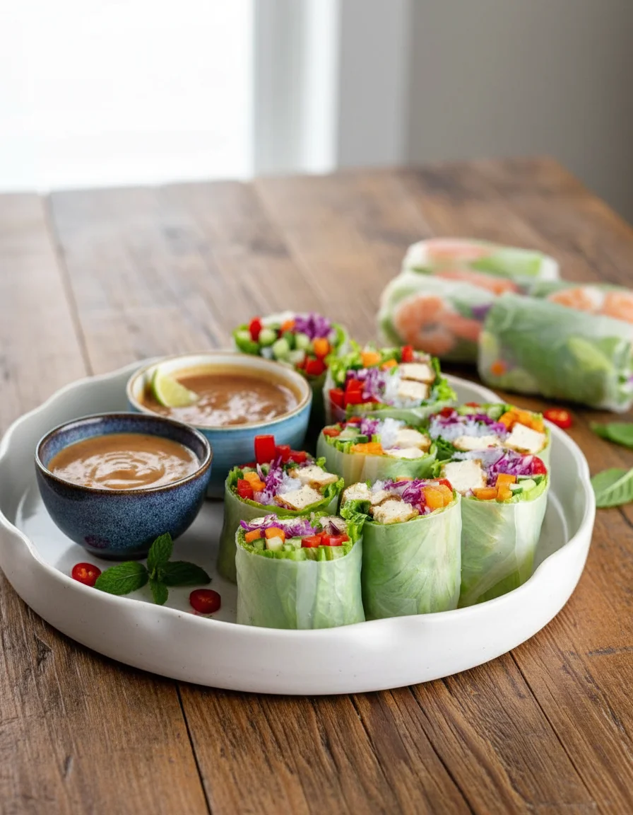 These Fresh Spring Rolls are a delightful option for a light lunch, a vibrant appetizer, or a refreshing meal to combat the heat. They are packed with colorful vegetables, tender vermicelli noodles, and crispy tofu strips, all delicately wrapped in rice paper and served with a zesty peanut sauce.