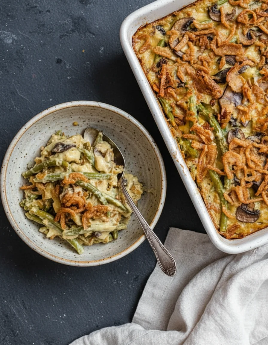 A rich and comforting green bean casserole, perfect for holidays and special gatherings. This recipe features fresh green beans enveloped in a creamy cashew and mushroom sauce, topped with crispy fried onions. It's a healthier, adaptable, and flavorful vegan twist on a classic side dish.
