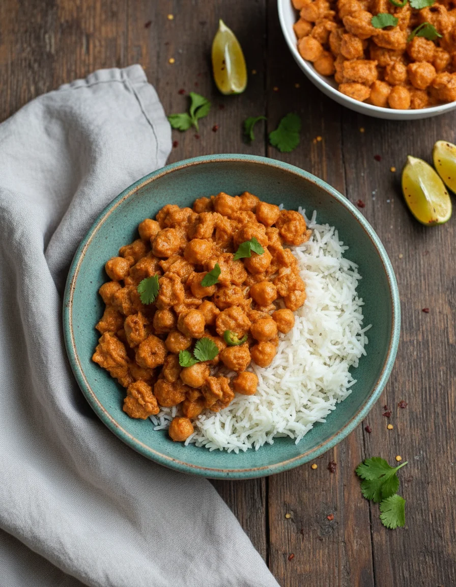 This creamy Instant Pot vegan butter chicken features soy curls and chickpeas, cooked in a rich Indian-spiced tomato sauce. It's a quick, one-pot, gluten-free, and oil-free recipe, with a nut-free option, perfect for a flavorful and hearty meal.