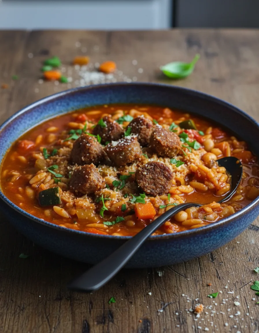 This vibrant vegan minestrone, inspired by an Italian classic, is loaded with fresh vegetables, orzo, and spicy vegan 'nduja paste for an extra kick. Topped with crispy vegan sausages and savory vegan parmesan, it's packed full of flavor and perfect for a cozy winter evening.
