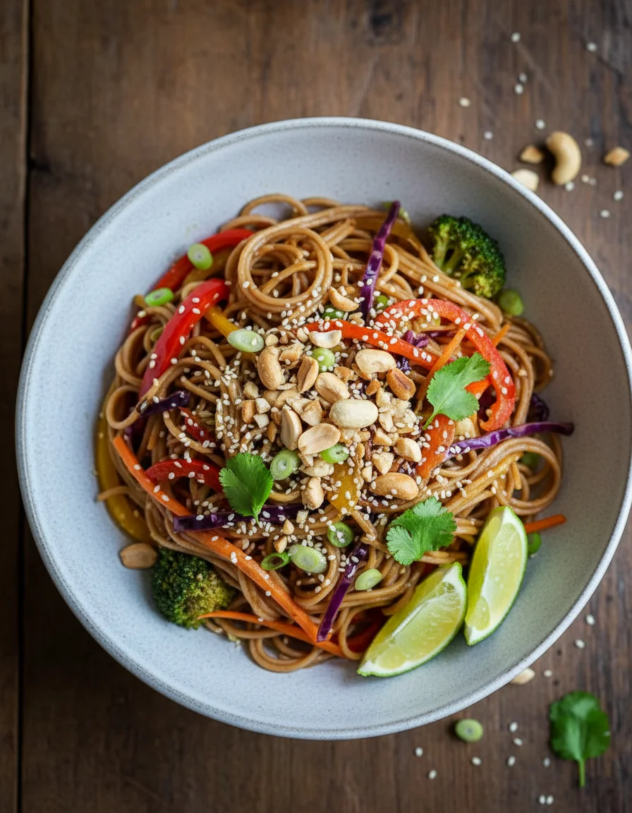 This vibrant noodle stir-fry, featuring a rich peanut lime sauce, is packed with crunchy, colorful vegetables. Perfect for utilizing seasonal produce or clearing out your fridge, this versatile and easy dish offers a nourishing and quick meal option.