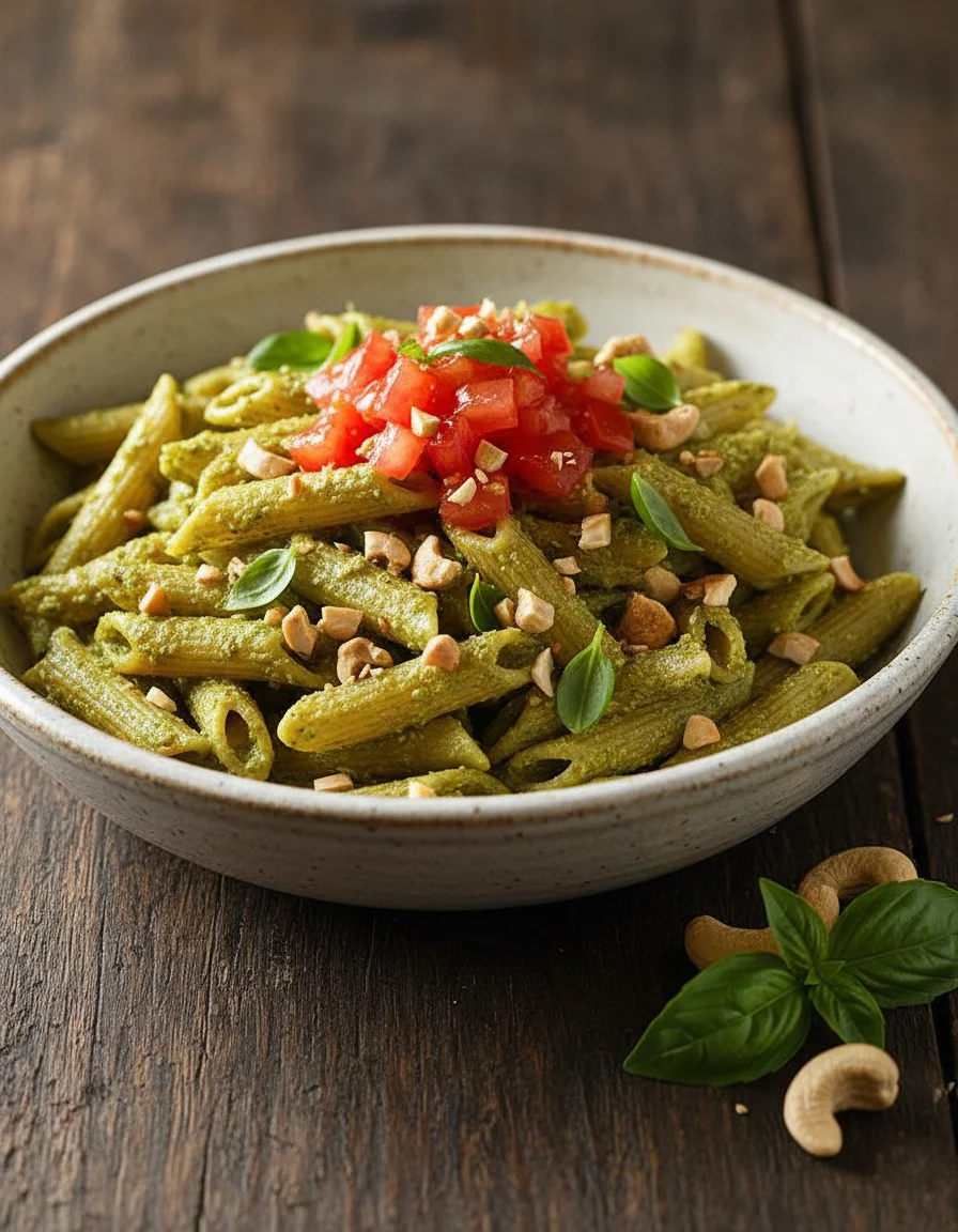 This super easy penne pasta dish features a homemade basil cashew pesto, vibrant asparagus, and sweet red bell pepper. It's a flavorful and quick vegan meal perfect for busy weeknights.