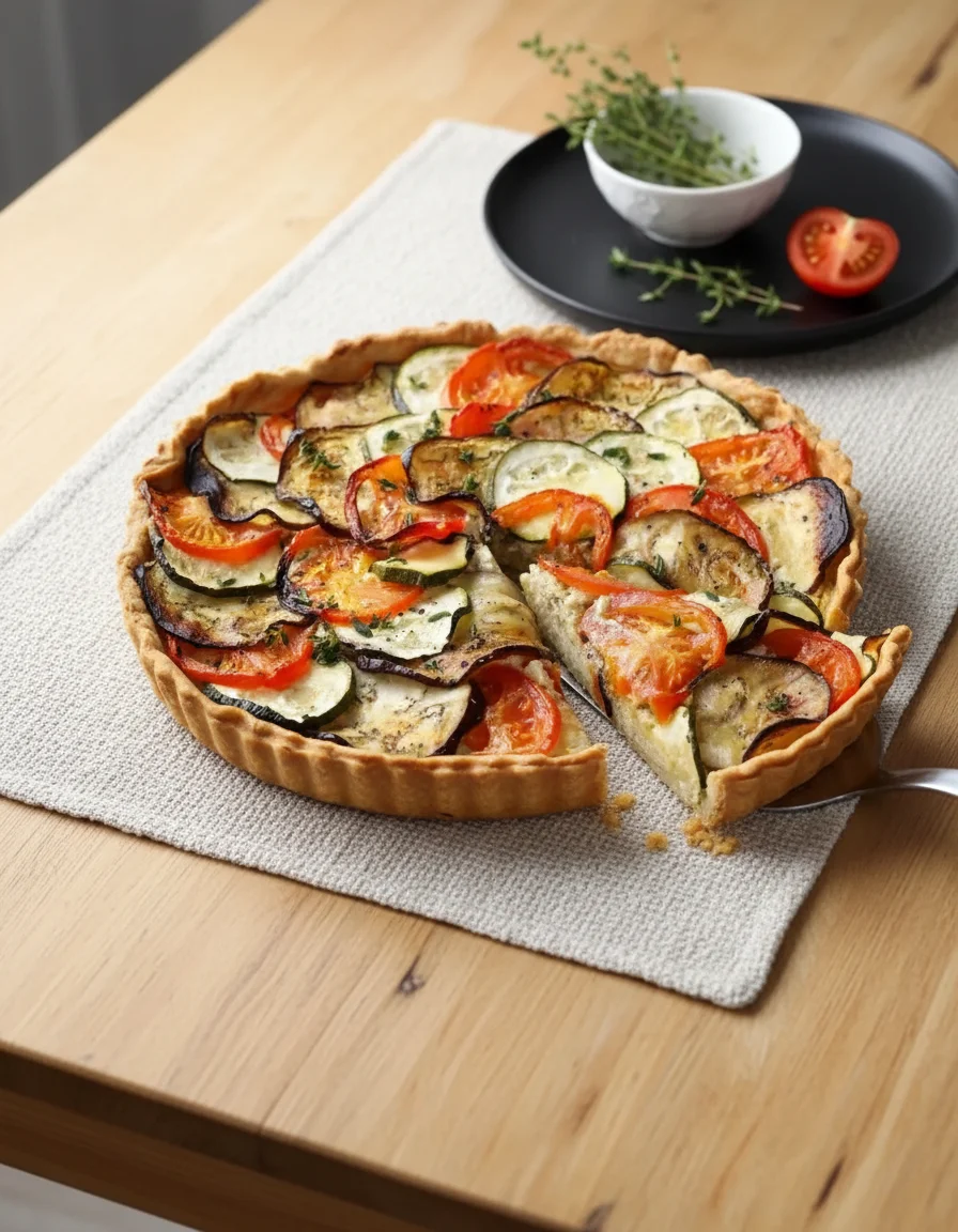 Spread the filling over the base of the tart. Arrange the [aubergine], [courgette], and [tomatoes] slices on top in concentric circles. Drizzle with extra virgin olive oil (2 tbsp) and a pinch of [salt] and [black pepper ground] to taste. Place in the oven for minutes (25). Scatter over the pine nuts (10 g) (optional) and bake for another minutes (10). The quiche should be set with a slight wobble. Remove from the oven and leave to cool. Drizzle with [extra virgin olive oil] and garnish with [thyme] leaves before slicing and serving.