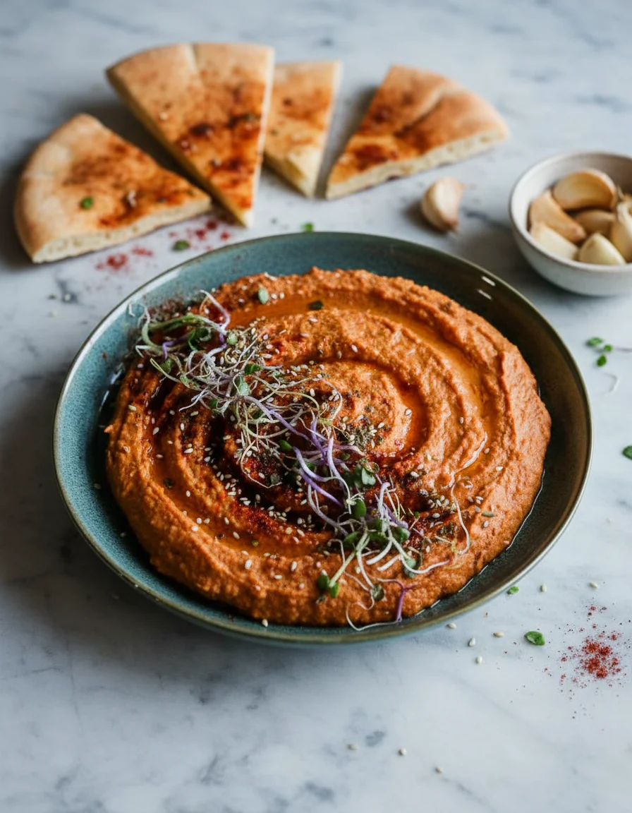 This vibrant red pepper hummus offers a smoky, slightly sweet twist on traditional hummus. Made by blending roasted bell peppers, chickpeas, tahini, lemon juice, and garlic, it's perfect as a dip, spread, or accompaniment to your favorite vegan dishes.