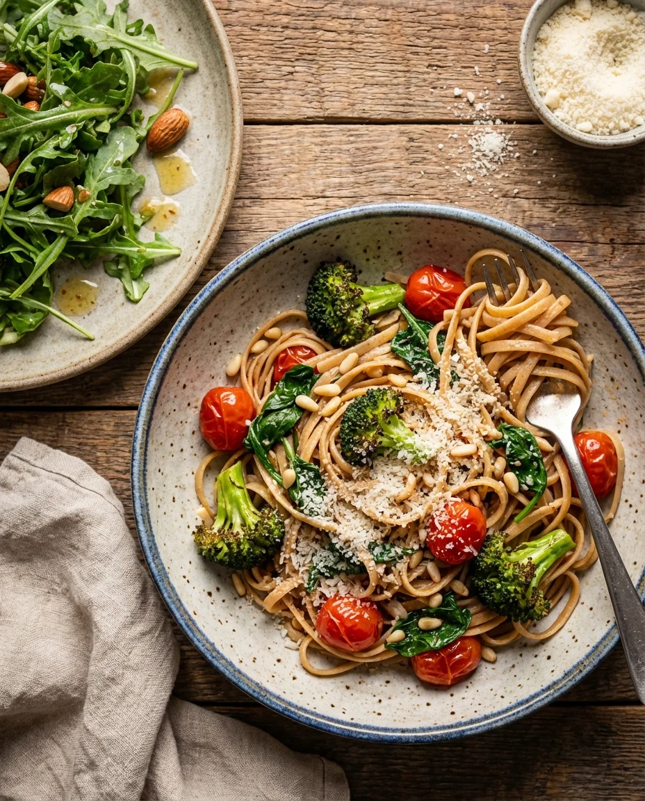 This nutrient-dense vegan pasta combines vibrant sautéed spinach with perfectly caramelized roasted broccoli and red bell peppers. Tossed in a light, silky balsamic and lemon sauce with savory notes of garlic and shallots, it is a wholesome meal that highlights the natural sweetness of oven-roasted vegetables.