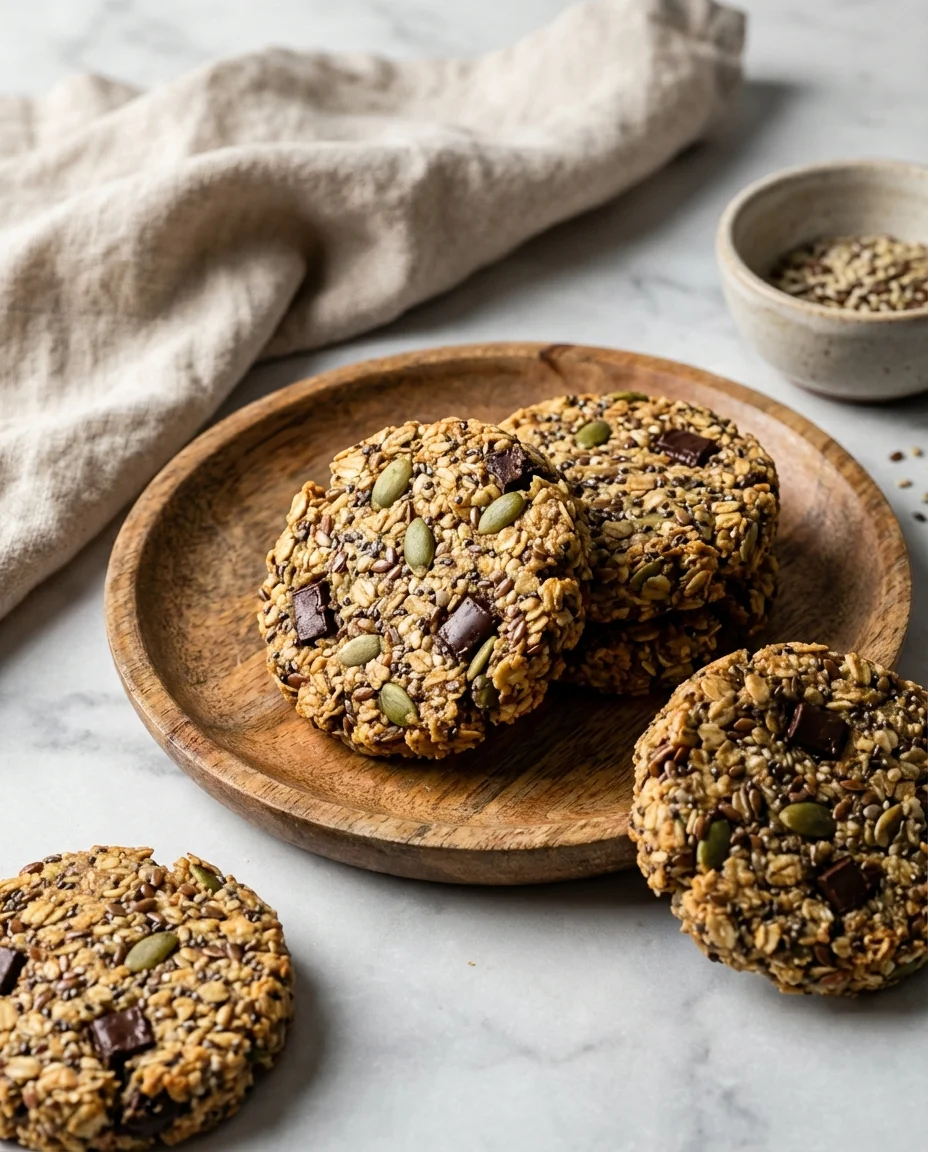 These wholesome cookies are packed with a nutritious blend of seeds, nuts, and dried fruit. Naturally sweetened with dates and banana, they are free from oil, grains, and gluten. Perfect for satisfying on-the-go breakfasts or snacks.