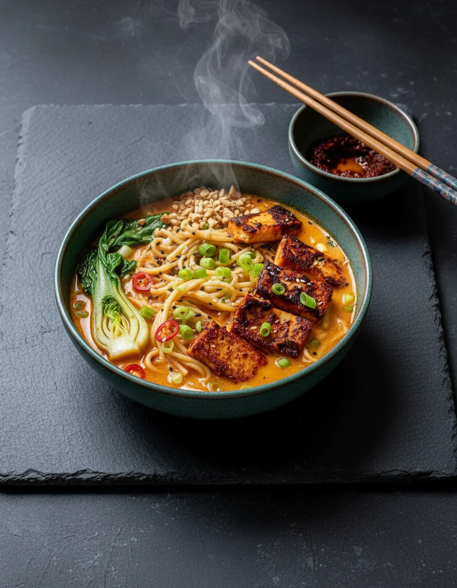 Spicy peanut butter ramen is a comforting one-pan meal featuring a creamy broth infused with gochujang, ginger, and garlic. It's topped with crispy gochujang tofu, offering a perfect balance of spicy, sweet, and rich flavors. This versatile dish can be customized with various vegetables and toppings.