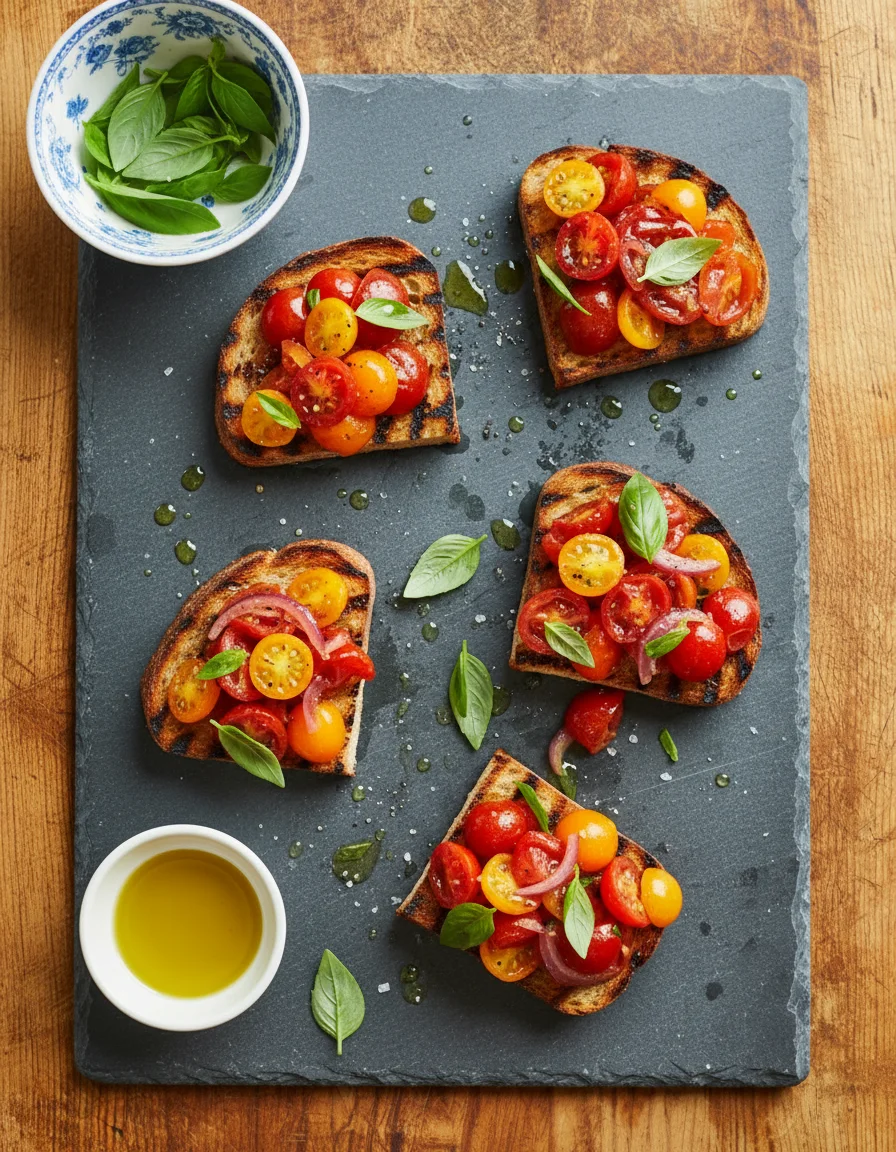 This vibrant bruschetta features ripe tomatoes and fresh basil, elevated by quality olive oil and a hint of herb vinegar. A versatile appetizer with endless topping possibilities, this classic combination is simply irresistible.