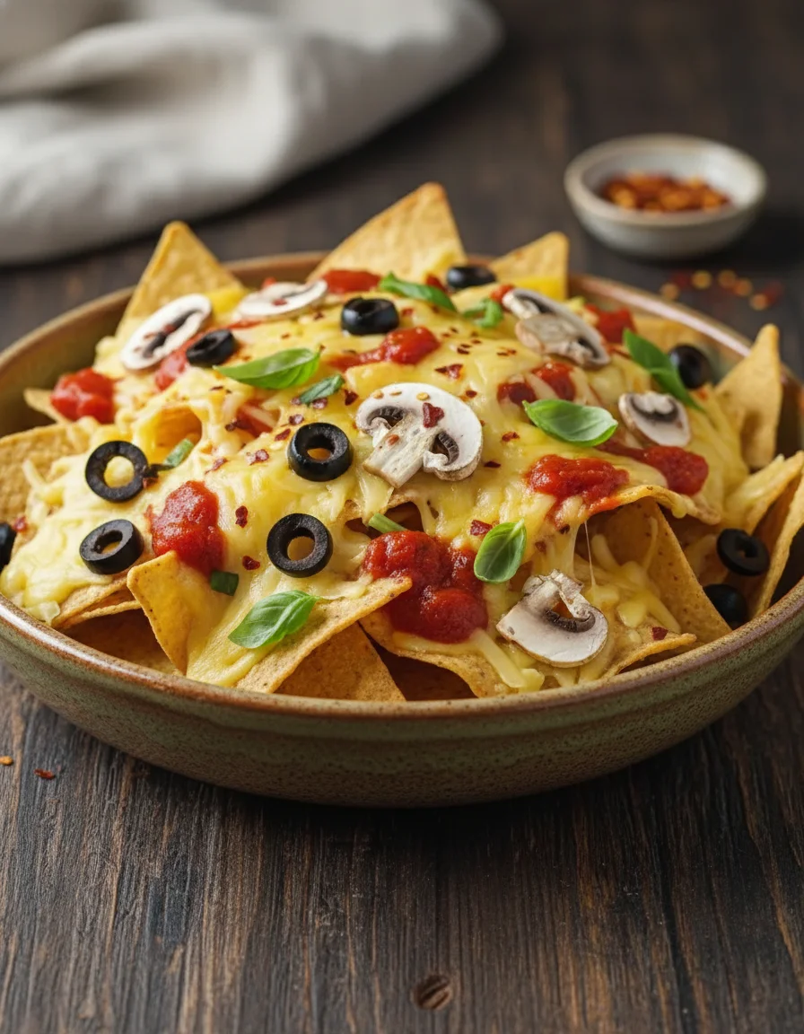 Transfer the cooked nachos to an oven-friendly pan. Top with pizza sauce (120 ml), plant cheese (0.5 block), sliced [mushrooms], [olives], and [fresh basil]. Grill for minutes (10) until the [plant cheese] has melted. Serve immediately.