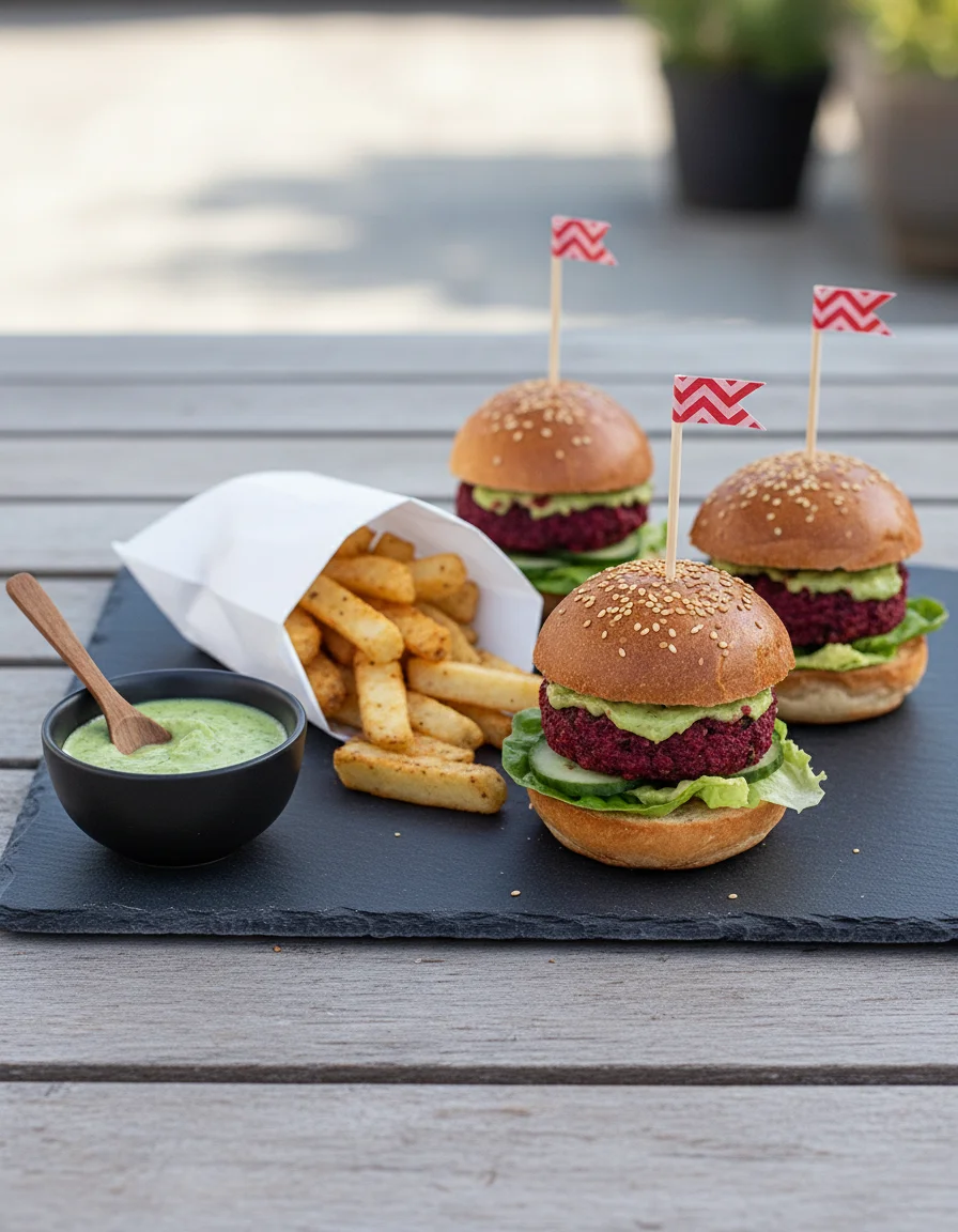 These indulgent vegan sliders feature flavorful beetroot and chickpea patties, seasoned with Sriracha. They are served on fluffy brioche buns alongside perfectly crispy homemade chips, offering a satisfying and wholesome meal.