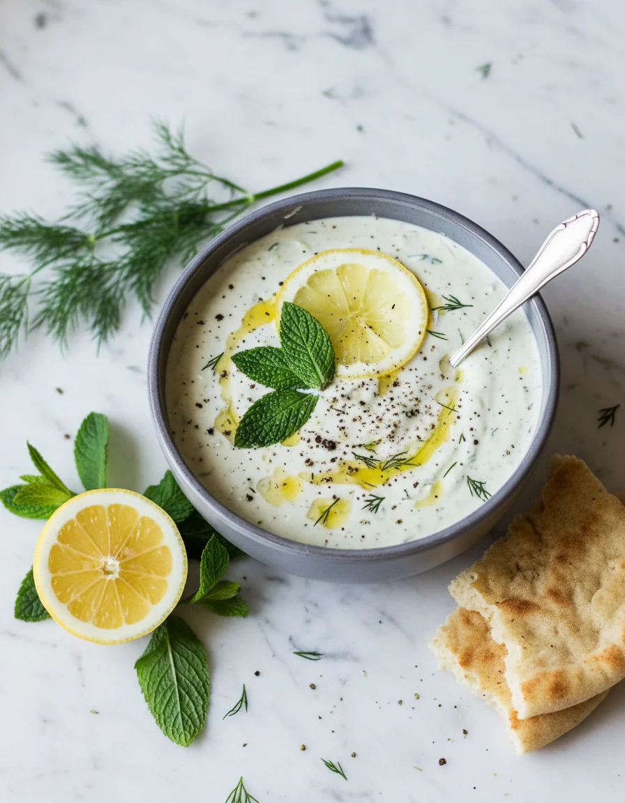This vegan tzatziki sauce offers an authentic taste experience with its creamy texture, achieved using cashews and chickpea flour. Seasoned with refreshing cucumber, mint, lemon, and garlic, this dairy-free dip is a versatile side, perfect with grilled vegetables or as a mezze.